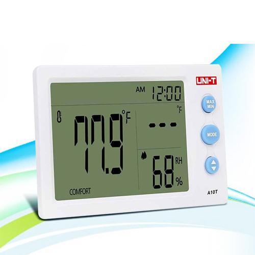 UNI T Digital Temperature Humidity Meter A10T measures real-time temperature and humidity and displays readings on a large screen. This A10T heat temperature meter can be used in both indoor and outdoor conditions. The A10T meter to measure humidity has an alarm clock and 12/24 hour modes. This meter temperature displays a comfort rating based on the combination of temperature and humidity. Hanging holes and tripods are available for wall or table mount.